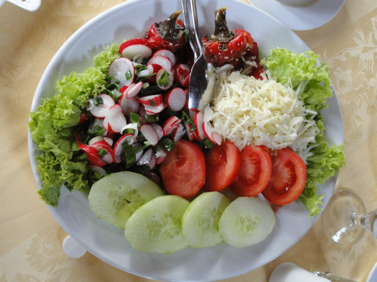 Пара слов о салатах. Самые популярные овощные салаты в сербской кухне — это српска салат и шопска салат. Состоят они из свежих помидоров, огурцов и лука, а разница между ними заключается в том, что в шопском есть еще и брынза.